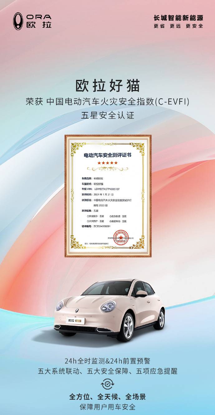 在用戶十分關注的電氣安全上,2024款歐拉好貓依舊不遺余力,整車416項整車電安全防護、24小時全時監測&24小時前置預警,五大系統聯動等舉措,給予用戶更踏實的安全感。而中國電動汽車火災安全指數(C-EVFI)五星安全評價的加持,進一步印證了歐拉好貓在安全方面的過硬實力。