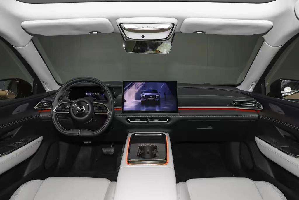 車內的話,長安馬自達EZ-6的設計布局和馬自達其它車型相比,也發生了較大變化。配有全液晶儀表和大尺寸懸浮式中控屏,整個內飾基本看不到多少實體按鍵,呈現出較高的簡潔性,向新能源車型看齊。