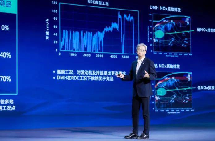 其次,DMH擁有更高熱效率占比,由于具有多檔位優勢。DMH能夠較多地在發動機最佳經濟區運行客戶常用工況點。其中,熱效率大于41%和40%的占比分別達到了35%和50%,遠超競品。最后,DMH擁有更好的RDE排放。