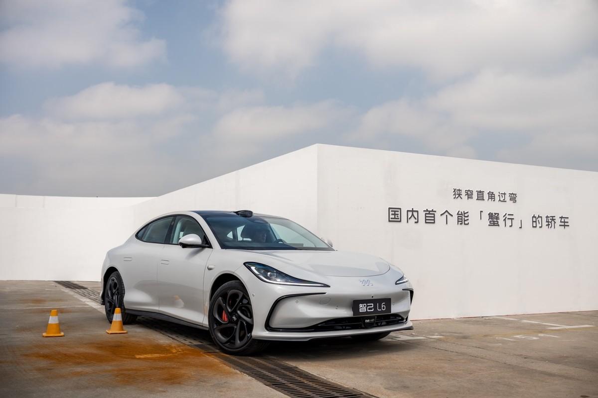 當(dāng)后輪與前輪同向轉(zhuǎn)動,那就到了智己L6蟹行模式的表演時間,此時車輛可以對角線方向平移,做到“橫著走”。先別急著扣上噱頭的帽子,在直角轉(zhuǎn)彎車側(cè)遇障礙,亦或是要貼邊停車的時候,四輪同向同角度偏轉(zhuǎn)帶來的“橫移”,會是神來之筆!