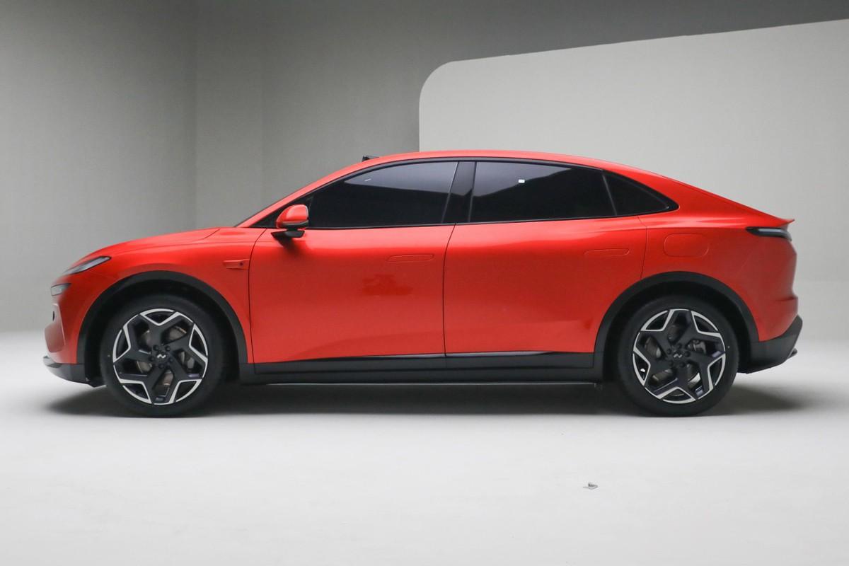 側面來看,這臺車采用了轎跑的設計風格,并配有掀背式尾門,而且該車還配備了無框車門、隱藏式門把手和隱私玻璃等設計,輪轂則是雙色星芒式造型。另外快充口和慢充口位于左后翼子板的位置。