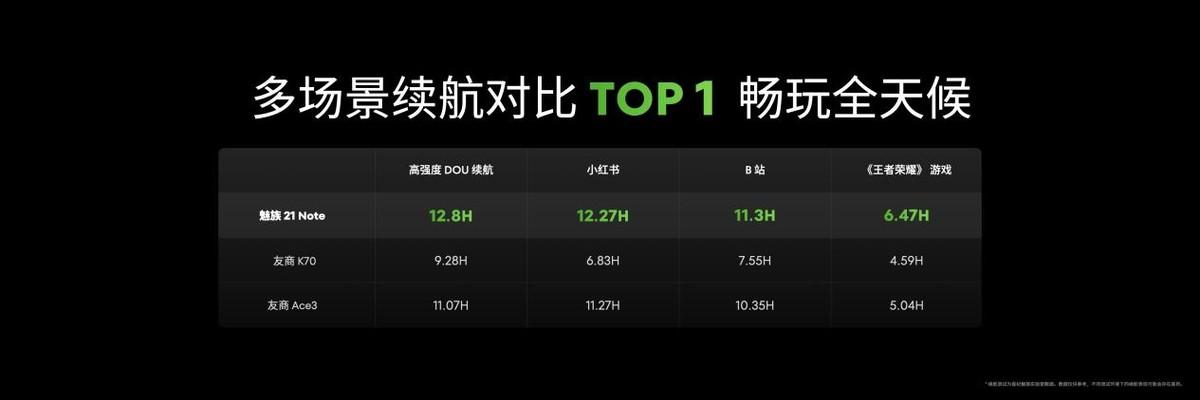 魅族 21 Note 的超長續航不僅僅在日常使用中體現,在魅族官方王者榮耀游戲手打測試中,取得了 6.47h 持續暢玩的優異成績,遙遙領先同價位性能旗艦。并且,AI 專項優化為魅族 21 Note 帶來了更出色的功耗表現,實現暢快游戲和持久續航的完美共存,一舉兩得。