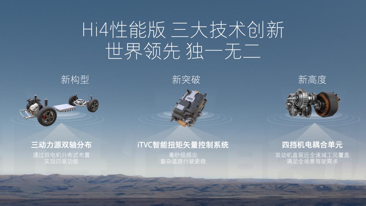 Hi4性能版由1.5T高熱效率發(fā)動(dòng)機(jī)、80kW高度集成四擋變速箱、150kW高性能電后驅(qū)動(dòng)橋、寧德時(shí)代35.04kWh三元鋰電池包以及全新升級(jí)的電控系統(tǒng)組成,系統(tǒng)綜合功率350kW,綜合扭矩達(dá)760N·m。