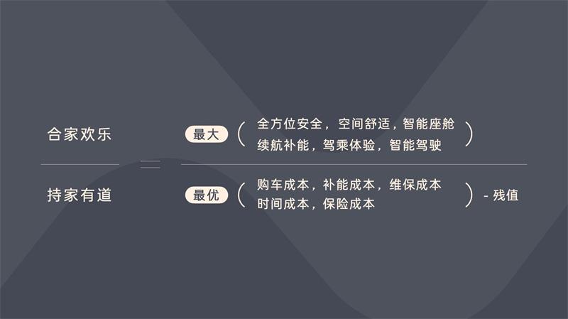 作為家庭用車新標準定義者,如上圖所示,樂道提出了一套價值公式。一方面,它將安全、空間、續航補能、智能化等產品本身的價值做到最大,另一方面,它將購買、補能、維保等成本做到最優。