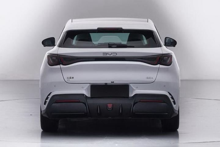 車尾部分,海豹X采用了家族式的貫穿式尾燈組設計,內部嵌有纖細的發光LED單元,搭配熏黑的燈殼配色,整體辨識度較高。往下看,后包圍還擁有非常運動化的擾流設計,中間位置甚至還有類似領航燈的倒梯形紅色裝飾,運動屬性足夠強烈。