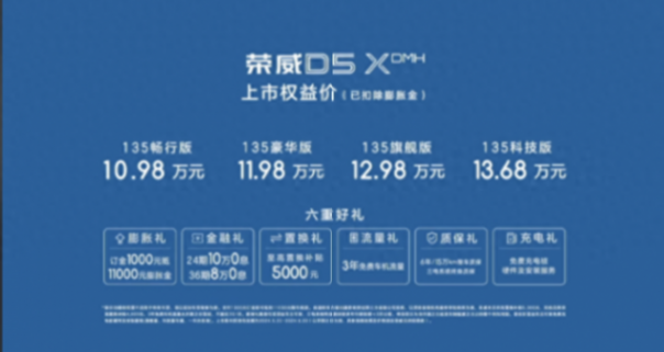 5月20日晚,榮威D5X DMH正式上市,新車共推出4款車型,正式售價區間為11.98-14.68萬元。上市現場,上汽乘用車同時推出購車限時權益,包括1000元預訂金抵扣11000元購車款的膨脹禮、金融禮、置換禮等六重購車優惠政策,最終,上市權益價區間為10.98-13.68萬元。