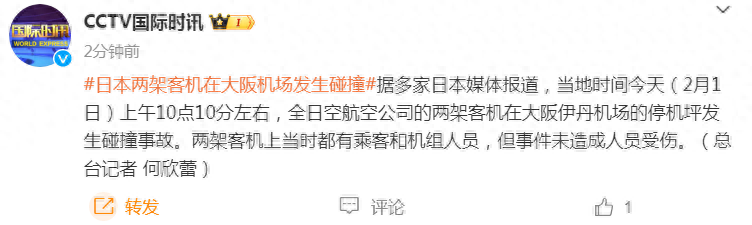 多家日本媒體報道,當地時間今天(2月1日)上午10點10分左右,全日空航空公司的兩架客機在大阪伊丹機場的停機坪發生碰撞事故。兩架客機上當時都有乘客和機組人員,但事件未造成人員受傷。