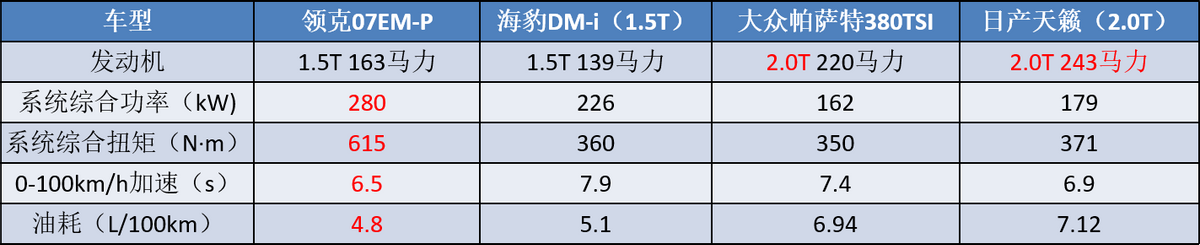 在這套動力的加持下,車子的零百加速能壓縮到6.5秒,油耗能降至4.8L/100km,擁有126km的純電續航(CLTC工況)。就參數來看,領克07EM-P算得上同價頂流,唯有純電能稍勝于它。