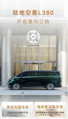 LEVC(即翼真汽車)旗下首款豪華純電MPV產(chǎn)品——“陸地空客L380正式開啟驚喜預(yù)訂。首批預(yù)訂用戶僅需支付2,000元意向訂金,即可享受優(yōu)先提車權(quán)益,且訂金隨時(shí)可退。此外,翼真汽車還聯(lián)合吉利旗下海南黃花梨山莊為首批訂購用戶精心準(zhǔn)備了獨(dú)具稀缺性、傳承性與增值價(jià)值的“木中黃金”——海南黃花梨手串作為奢享伴手禮。