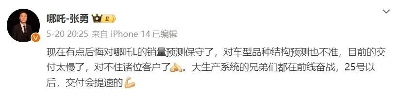 從5月來看,哪吒的新車哪吒L已經(jīng)上市,從官方透露出來的信息顯示,這款車的銷量還不錯。在4月底,哪吒汽車CEO張勇稱,哪吒L在5月產(chǎn)能目標是6,000臺,他預計這個車后續(xù)好好營銷,月度銷量沖擊“一個小目標”是大概率的事情。而到了5月20日,張勇又說對哪吒L的預測保守了。