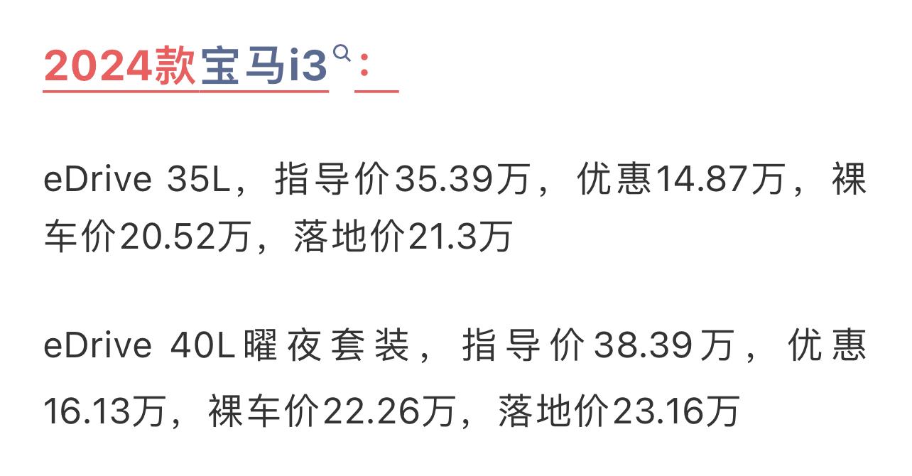 下面就來(lái)分享一下,寶馬i3在5月份的真實(shí)行情。指導(dǎo)價(jià)35.39萬(wàn)的35 L入門(mén)款現(xiàn)在終端的優(yōu)惠已經(jīng)接近15萬(wàn),裸車也就20.5萬(wàn)左右,電車沒(méi)有購(gòu)置稅,所以這車加保險(xiǎn)的落地價(jià)也就21.3萬(wàn)上下。40 L耀夜套裝更狠,優(yōu)惠能達(dá)到16萬(wàn)多,全款落地不到23.16萬(wàn)。