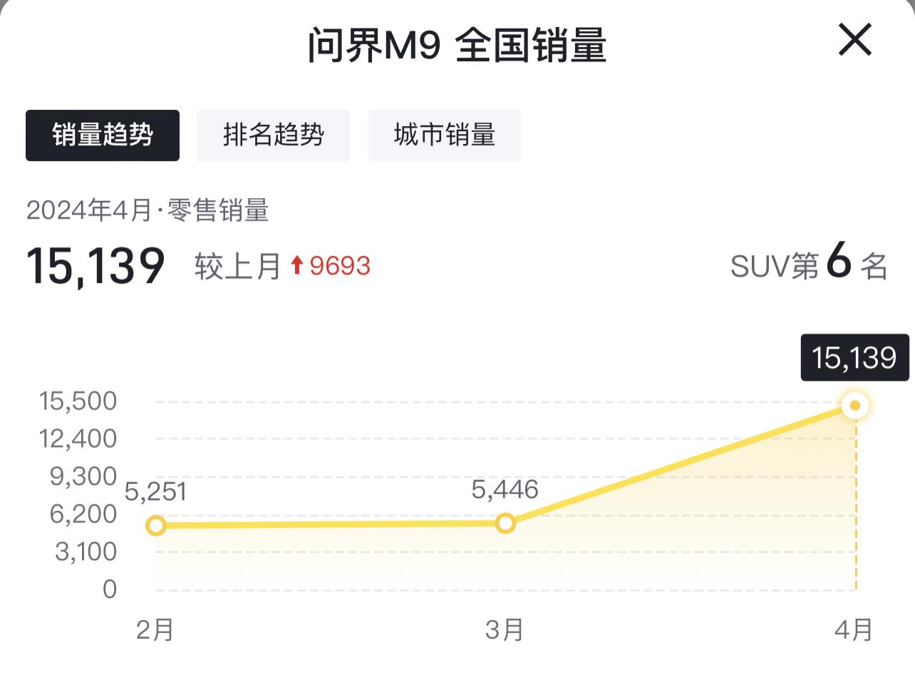 第6名,問界M9,月銷15139輛。一個均價四五十萬的豪車,一個月賣15139輛,沒啥可說的,遙遙領先,華為牛逼。