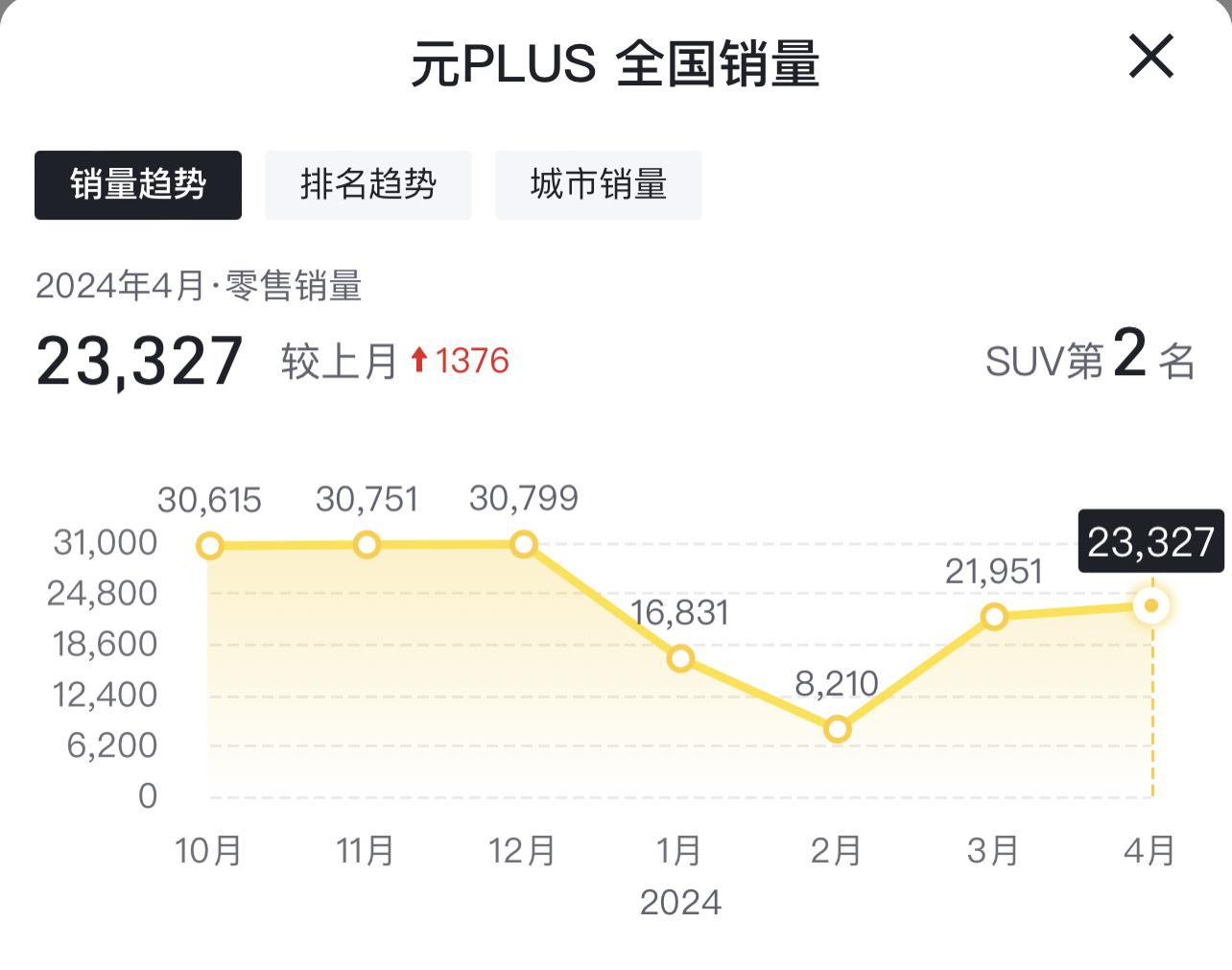 第2名,比亞迪元PLUS,月銷23327輛。10萬出頭的價格,想買純電SUV,元PLUS就是首選。顏值高,銷量高,口碑高,而且同價位幾乎沒競品。