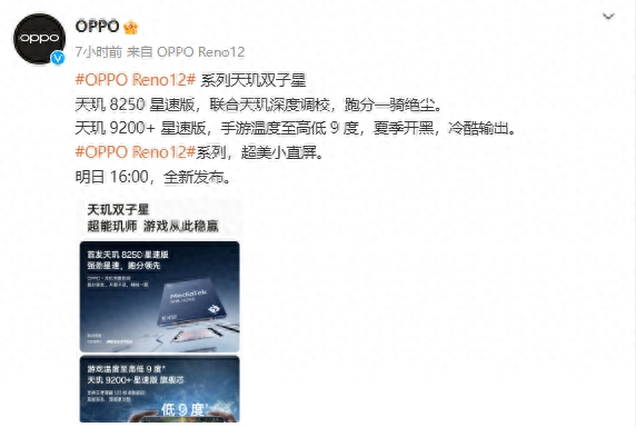明日見(jiàn)!OPPO Reno12系列搭載天璣8250星速版/天璣9200+星速版
