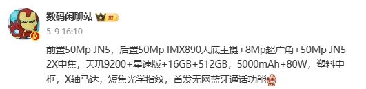 此外,數(shù)碼博主@數(shù)碼閑聊站 此前的一份爆料中提到:“前置50Mp JN5,后置50Mp IMX890大底主攝+8Mp超廣角+50Mp JN5 2X中焦,天璣9200+星速版+16GB+512GB,5000mAh+80W,塑料中框,X軸馬達(dá),短焦光學(xué)指紋,首發(fā)無(wú)網(wǎng)藍(lán)牙通話功能”。
