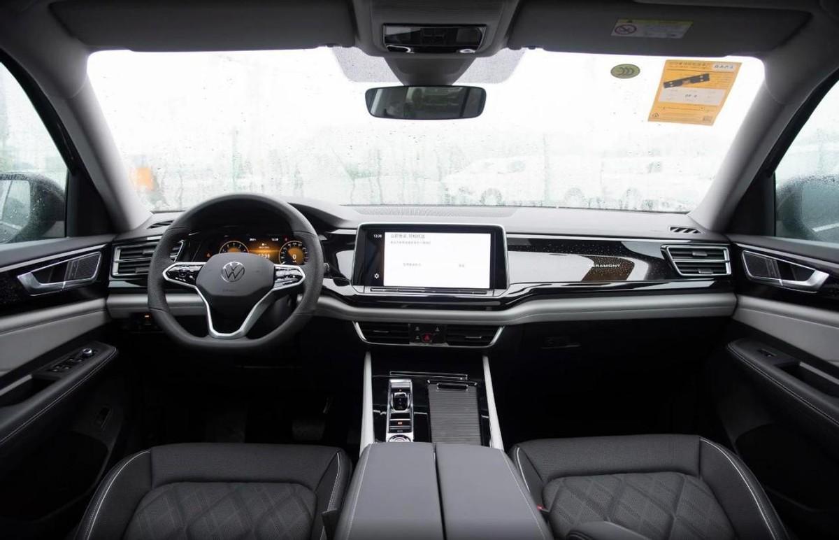 進入車內,大眾途昂的內飾設計簡潔大方,使用了雙拼色搭配,中控臺裝飾板借鑒了“星空”的設計,點亮后氛圍感很足。不過,內飾的塑料感也是很明顯的,特別是中控臺靠近中央通道的一側,隨手就能摸到硬塑料。儲物空間不用多說,除了常規的門板儲物槽和杯架以外,中控臺下層通道也有空間可以利用,實用性較好。