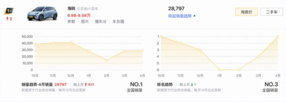 通過在新能源市場的持續發力,為旗下眾多車型推出了榮耀版,進而實現了全線價格下調的比亞迪,在王朝系列與海洋系列當中均有不同的斬獲,但主要的銷售貢獻還是來源于比較入門的A0級、A級新能源車市場。其中,比亞迪海鷗(6.98-8.58萬元)作為為數不多出現銷量上漲的車型,通過數千元價格下調,進一步鞏固了同級優勢,并在整個轎車市場成功奪冠,也徹底甩開了五菱繽果等競品,順理成章地成為了小型車市場的統治者。