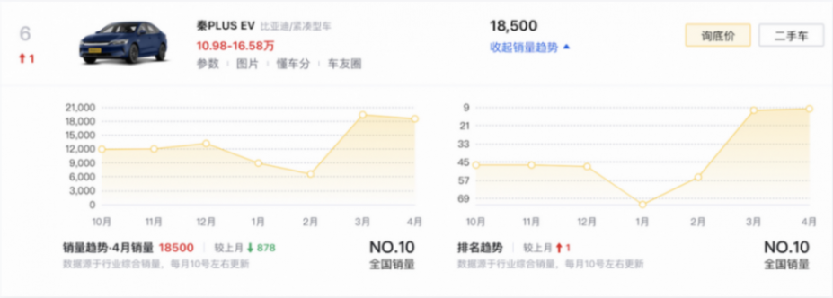 而在A級轎車市場中,同時推出并上市榮耀版的秦PLUS DM-i(7.98-14.28萬元)、驅逐艦05(7.98-12.88萬元)、秦PLUS EV(10.98-13.98萬元)也分別拿下了第二名、第五名、第六名的好成績,在整個轎車市場TOP10之中為比亞迪奪下了一共4個名額,從95474輛的整體銷售數據上看也真正意義上占據轎車市場TOP10的“半壁江山”(轎車市場TOP10整體銷售量為199812輛)。