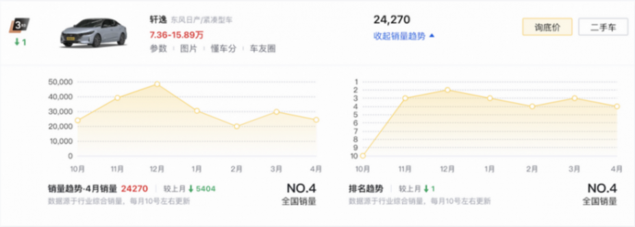 而作為轎車市場的“傳統冠軍”,日產軒逸(10.86-17.49萬元)與大眾朗逸(8.00-15.19萬元)被比亞迪擠到了第三名、第四名的位置,兩款車型雖然都實現了單月銷量破萬,但均遭遇了不同銷量下滑,其中,日產軒逸月銷量較上月更是少了5400多輛,在日產不斷推新,還給出了更接近于新能源的汽油電驅版、更低價位的經典版,但依舊難以阻止國產新能源的沖擊。