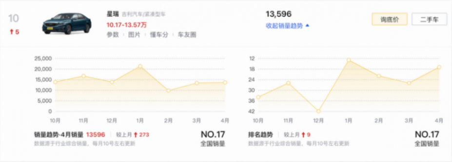 排在4月轎車市場TOP10最后一位的是吉利星瑞(10.87-14.57萬元),依靠著去年星瑞L智擎的加入、3月的兩款2.0TD車型上新,星瑞家族的號召力得到了增強。盡管還未能恢復到最佳狀態,但配置更高的新車型卻會進一步提升產品的性價比,讓消費者在看不上的自主A級與買不起的合資B級之間有一個“緩沖選項”,不到13萬元的門檻卻有2.0TD、翻毛座椅、BOSE音響以及遙控泊車等功能配置,這樣的星瑞青云版的確還是很有吸引力的。