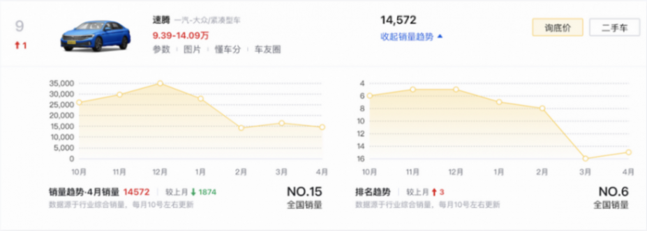 比起成為日系獨苗的軒逸,TOP10當中的大眾系產品還包括了帕薩特(18.19-24.33萬元)、奧迪A6L(42.79-65.68萬元)以及速騰(12.79-17.29萬元),它們在本月分別占據了第七至九名的位置,銷量均達到了1.4萬輛以上。三款車型在進入到2024年后都遭遇了較大幅度的銷量下行,最差一個月的銷量都只有去年12月的一半,而帕薩特依靠著即將到來的換代前促銷,實現了一定程度的回暖,奧迪A6L也在等待換代車型的過程中帶來了前所未有的優惠力度。相對來說,速騰保持了一種比較常規的年度改款頻率,在上個月完成了更新,其最大的變化在于調整了最低燃油標號,能夠實現92號汽油的兼容,在高油價時代,這樣的優化會讓大眾在動力效率方面的優勢得到鞏固。