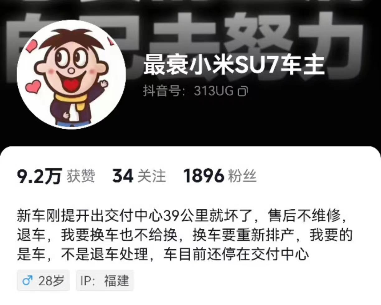 破天的流量,讓小米SU7獲得了極高的關(guān)注度,這不剛剛又登上了熱搜,原因是有車主稱:剛提小米SU7行駛39公里,新車就出現(xiàn)了故障,拋錨在路邊,交付中心稱:無法維修和換車,小米表示:可退車,并承擔用戶因退車產(chǎn)生的損失。
