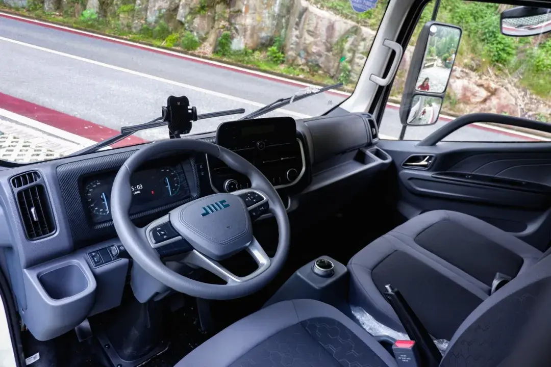 在試駕過程中,除了動力感受強烈外,E路達的操控感也給我留下了深刻印象。車輛在山路急轉彎的時候側傾很小,感覺底盤很穩,這得益于它850mm寬體車架+橫向穩定桿以及電池包中置設計。實際上,江鈴輕卡在底盤技術上的行業領先是最無需多言的。