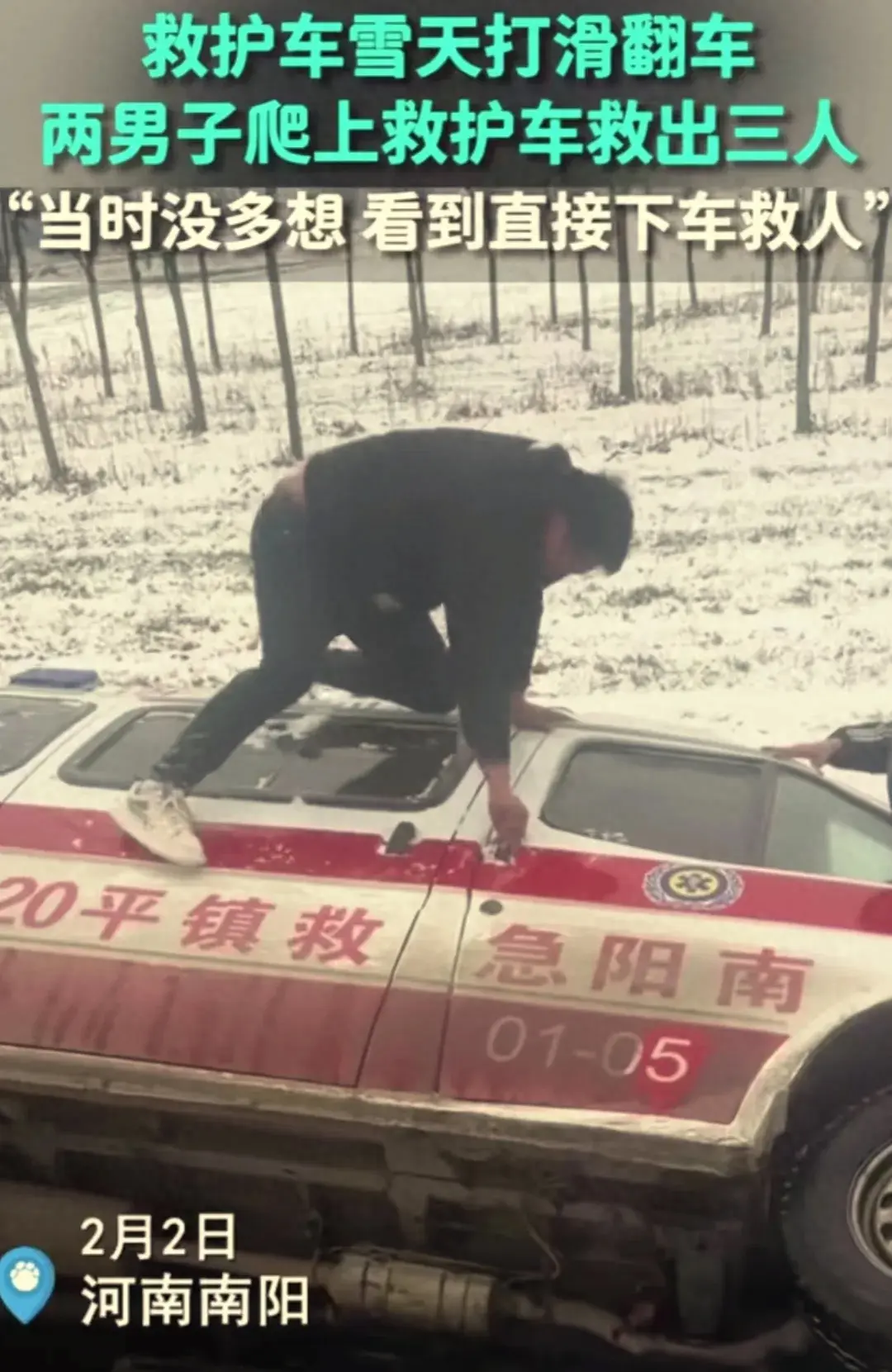 由于大雪天路打滑,一救護車在去接人的路途中翻車了,這時兩熱心男子出現了,這兩個男子當即爬上救護車救出了被困在車里面的三個人:兩個女的和一個開車的司機。