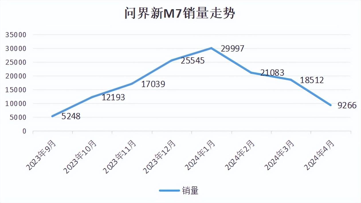 而值得一提的是,在問界新M7 Max煥新版上市之前,2023年9月上市的問界新M7已經表現出嚴重的后勁不足的趨勢,在剛剛過去的4月份已經下滑至9266輛。