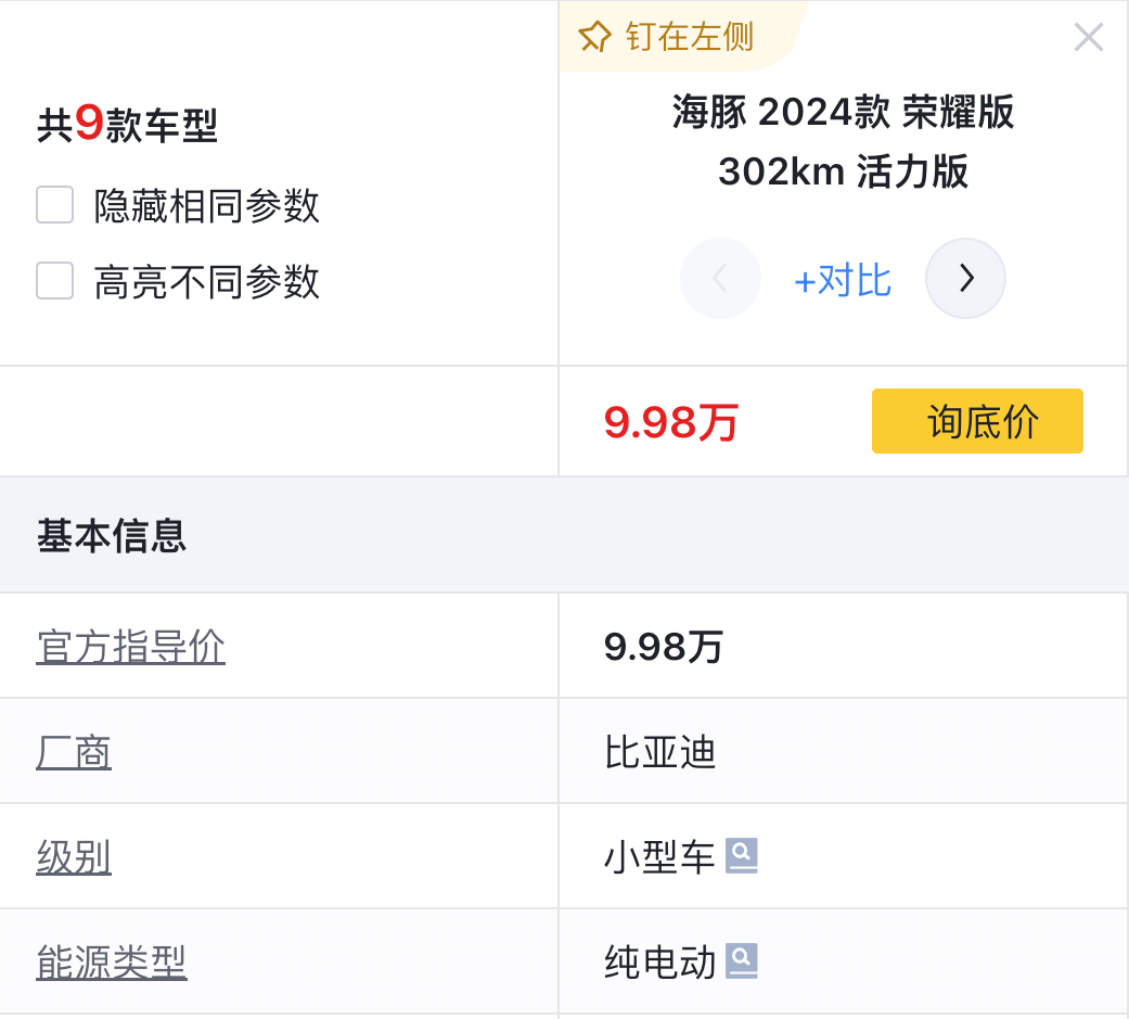 而在2024年,海豚也做出了不小的升級,首當其沖的就是底盤從原先的板車懸掛升級為獨立懸掛,整體的操控表現、舒適性有所提升。不過在價格上,海豚并沒有直接參與價格戰,雖說把定價降到了10萬內,但入門車型活力版工信部續航僅為302公里,實用性要打不小的折扣,并且70kW的電機在當下市場下,也顯得有些保守。