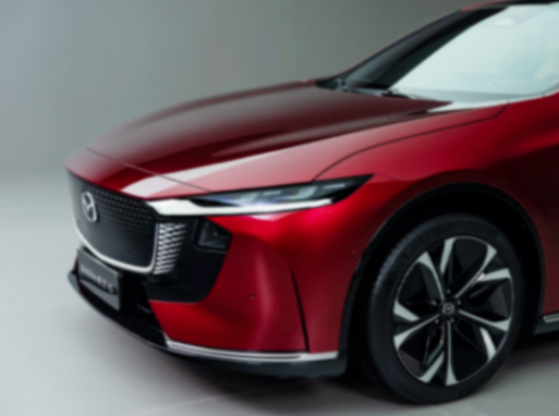 若是只看車頭,馬自達EZ-6還是有著很明顯的家族化特征,純電版采用滿天星樣式的封閉式格柵,中間鑲嵌可發光的馬自達車標,下半部分有著半包裹式的環繞燈帶,車頭兩側插入扁平犀利的日行燈組,遠近光燈則隱藏在下方黑色區域,顯得很有設計感。