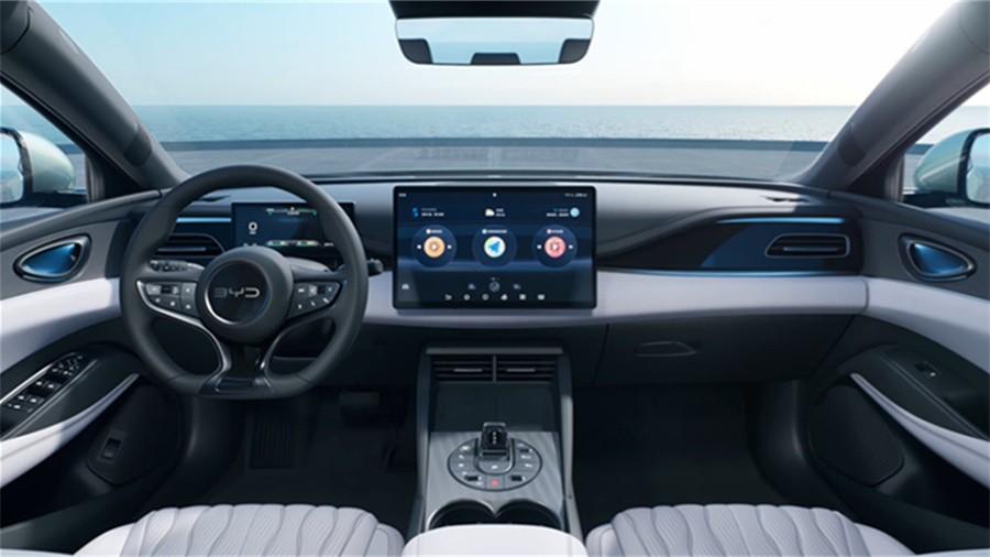 而海豹06的因為采用了海洋系列的設計語言,因此相比秦L有著更多的曲線變化,方向盤的造型也沿用了非常經典的如同海豚尾部一般的形狀。另外,懸浮式的液晶儀表盤、15.6寸中控屏也更加顯得科技感強烈,副中控臺上的電子檔桿造型更加小巧精致。