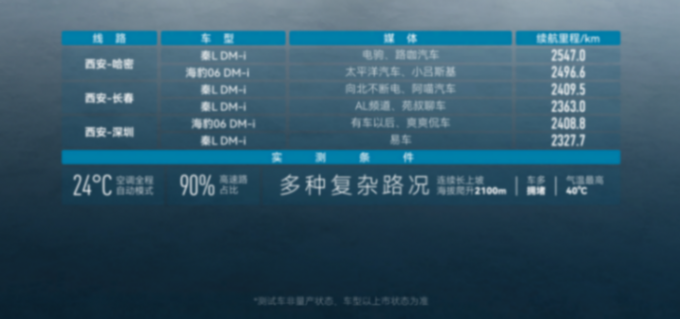 而按照比亞迪的“常規操作”,實測表現肯定是不止于此的。發布會上公布的媒體實測中,百公里虧電油耗全都低于2.5L,海豹06最低開出了1.79L;滿油滿電綜合續航全部超過2300km,秦L綜合續航最長的更是達到2547km。