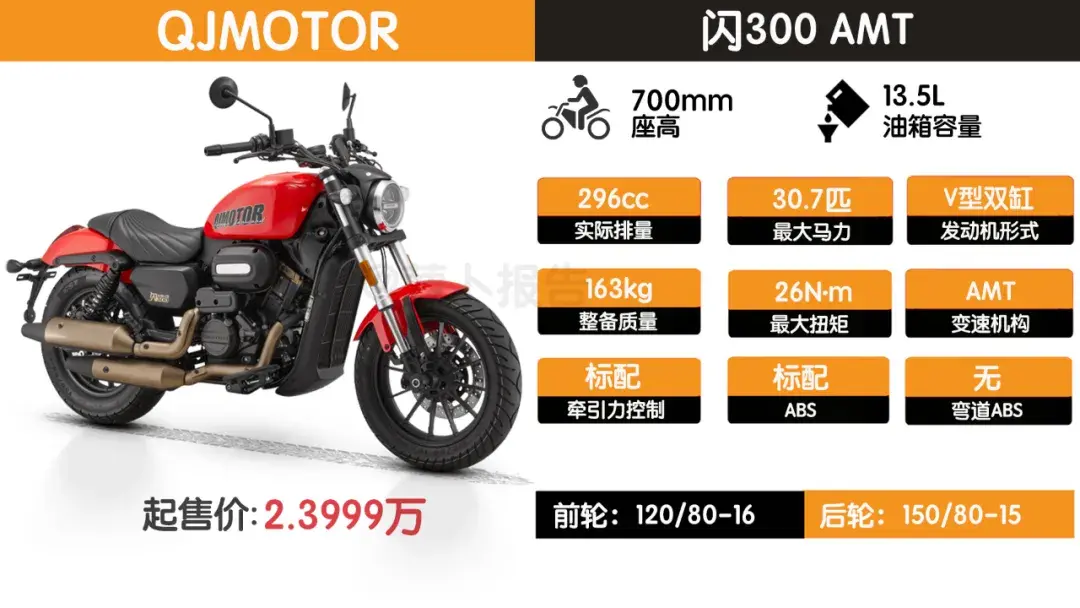 但這個無離合換擋就打破了限制,目前對于自動擋車型已經有很多廠家在研發。此次北京國際摩展上QJMOTOR的閃300AMT和長城8缸靈魂都是此類車型,完全符合通行標準。