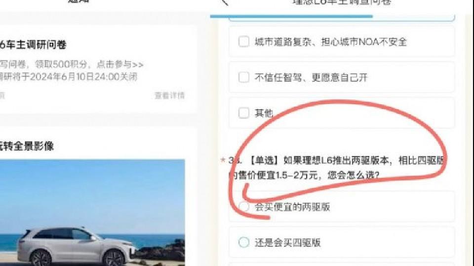現在理想旗下的車型,無論是MEGA還是L系列,都在堅持做著雙電機版本,但最近關于新車主調研的問卷里,我們看到了一絲單電機版本理想L6的苗頭。而這次的問卷調查,看起來也像是在做預熱,很有可能這已經是理想L系列規劃的新增車型。