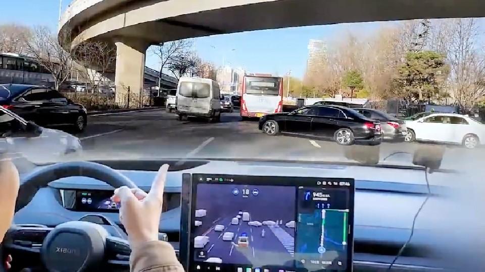 還有在面對(duì)無序車輛在十字路口擁堵的情況下,小米SU7也會(huì)通過跟隨規(guī)劃路徑按序行駛的形式來通過擁堵路口,整個(gè)過程沒有被駕駛員接管,這是一個(gè)不錯(cuò)的體驗(yàn)。但,整個(gè)過程的操作執(zhí)行,會(huì)有一些“猶豫”和延遲。