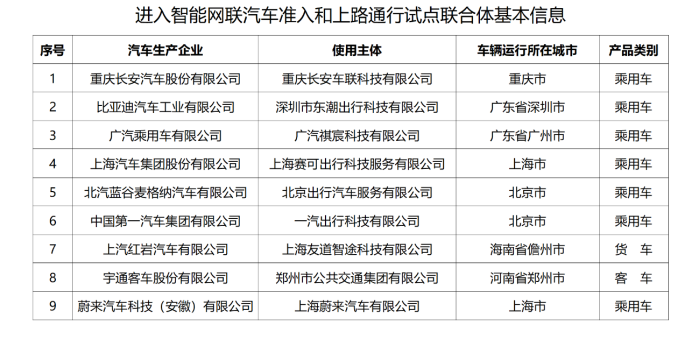 首先,如果你點開相關車企的宣傳新聞稿,會發現內容都指向工信部等四部門發布的一則關于部分車企進行自動駕駛上路試點的通知,當中附了一則名單:
