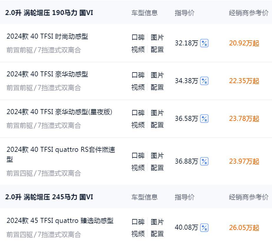 相比于幾年之前的奧迪A4L,現(xiàn)款?yuàn)W迪A4L在動(dòng)力配置這一塊,可以說厚道了很多,因?yàn)楫?dāng)時(shí)還有1.4T的奧迪A4L。2024款全系搭載2.0T渦輪增壓發(fā)動(dòng)機(jī),分高低功率,其中低功率車型最大馬力190Ps,峰值扭矩320N·m,搭配7速濕式雙離合變速箱,百公里加速時(shí)間8.3秒—7.9秒(RS套件燃速版加速較快),WLTC綜合油耗6.9L—7.51L(廠商數(shù)據(jù))。