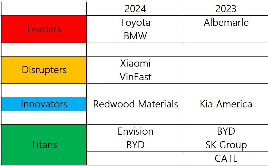 比亞迪與遠景入選巨頭(Titans)類別,入選該類別的其他企業包含亞馬遜、空客、迪士尼、英偉達等。