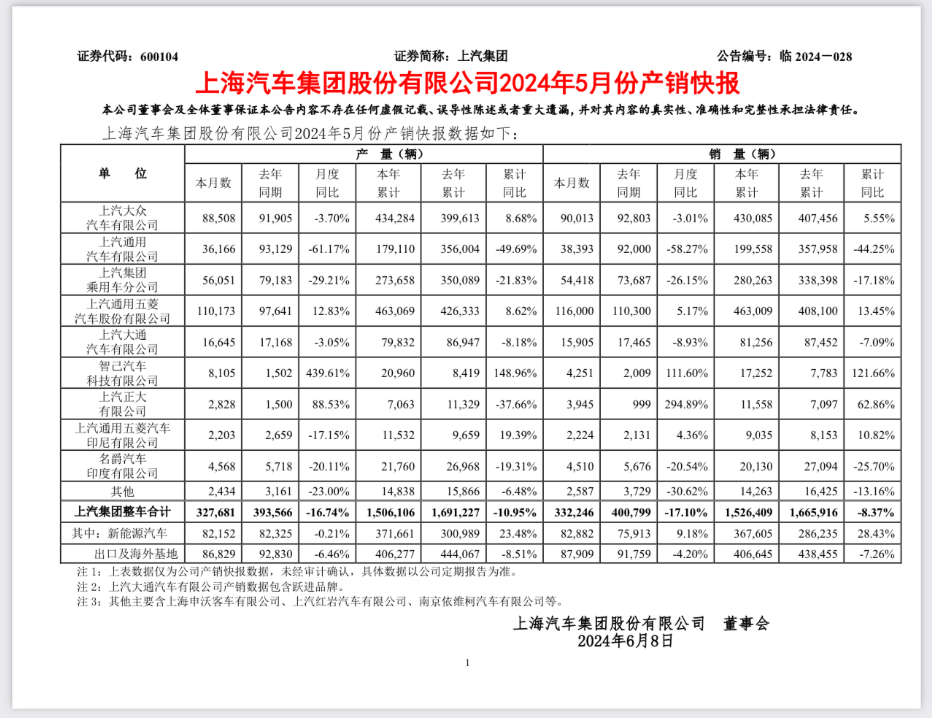 更讓人擔憂的是,上汽集團的官方數據顯示,2024年1-5月份,上汽通用的累計銷量為199558臺,同比降幅為44.25%。