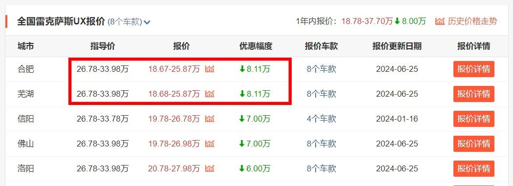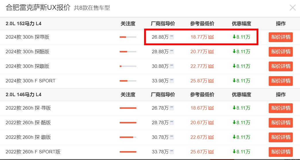 很多人可能都不知道,原價(jià)26.88萬的雷克薩斯UX車型,目前終端優(yōu)惠完之后的最低價(jià)格也已經(jīng)來到了18.67萬元左右。而其優(yōu)惠幅度則是可以高達(dá)8萬多,且是全系車型都有這一降幅,你這受得了嗎?
