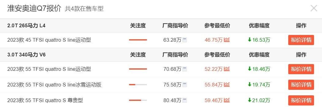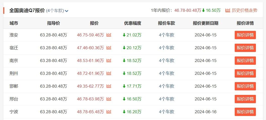 奧迪Q7作為一款純進口的豪華中大型SUV,廠商售價是63.28-80.48萬元,放在以前,那也絕對是能夠與奔馳GLE、寶馬X5等德系競品所齊名的車型。不過,由于現款奧迪Q7已多年未換代,所以它在終端優惠方面也著實是大的驚人。