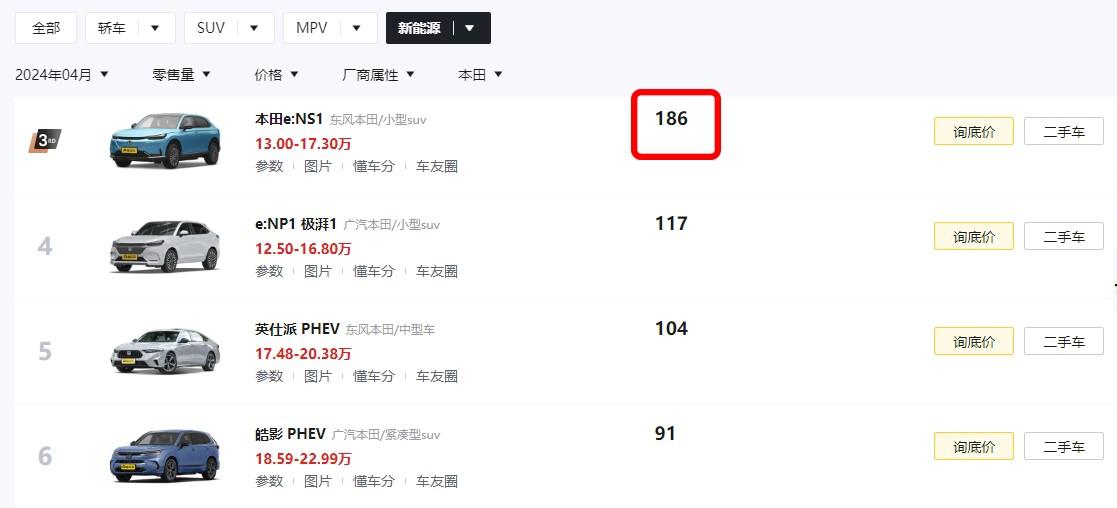 畢竟,真要論純電車型的銷量,東風本田e:NS1在4月份的銷量數據可是只有186輛新車,不能說是極差,但應該也沒有比這更差的銷量數據了吧。所以啊,面對在新能源領域轉型如此艱難的東風本田,你們說能不讓人為其感到擔憂嗎?