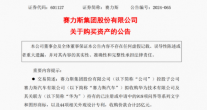 7月2日晚,賽力斯發布公告稱,將以25億元收購華為持有的問界等系列文字和圖形商標,以及相關外觀設計專利。今年4、6月份,華為已將持有的“享界”“智界”兩個商標轉讓給合作車企北汽、奇瑞。