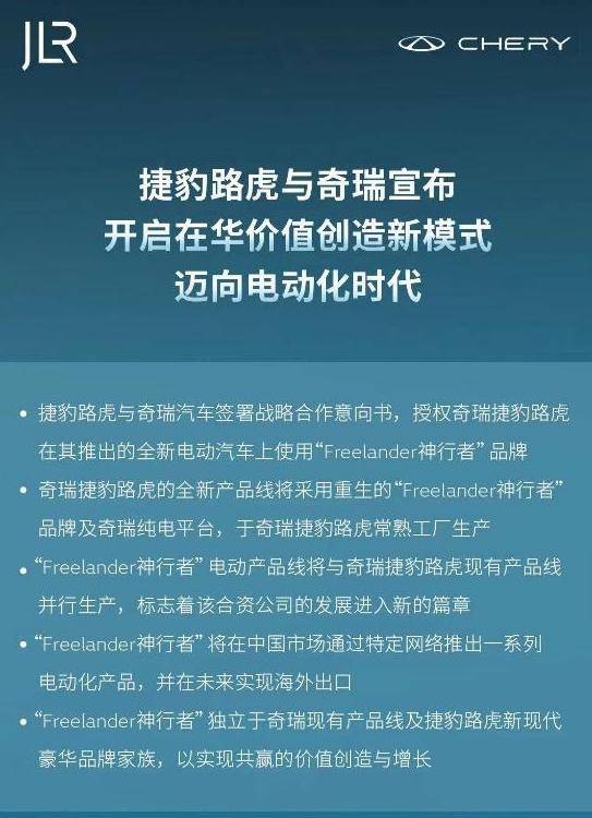 中外合資雙方重磅官宣的核心信息是,捷豹路虎授權合資公司使用原路虎旗下的“Freelander神行者”品牌生產合資電動化車型,而電動化產品的技術架構則由中方合資伙伴奇瑞輸送。目前,雙方已經簽署戰略合作的意向書,具體操作細節仍有待商榷。