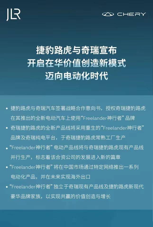 6月19日,捷豹路虎與奇瑞官宣:已于近日簽署戰略合作意向書,擬共同推進全新合作模式。基于此,奇瑞捷豹路虎將推出并制造一系列電動產品,搭載奇瑞電動化平臺,使用捷豹路虎授權的“Freelander神行者”品牌。消息公布后,再度引發了汽車圈的廣泛討論。