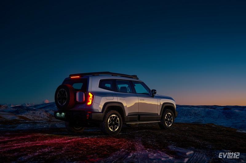 尾門與備胎黑色構件形成整體,由賽博金屬切割的外圍緊密包裹,與背部結構完美融合。配備備胎也是越野車型常規的操作之一,這無疑會給用戶帶來更多挑戰極限的信心。