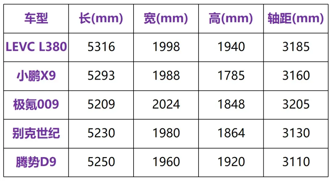 級別定位上,L380的定義是中大型MPV,但它的外部尺寸超過了目前幾乎所有中大型MPV。如上表參數對比,其它幾款主流的中大型MPV,車長都在5.2-5.3米之間,L380則達到了5316mm,同時1998mm的車寬,也超過了極氪009之外的絕大多數同級車型。