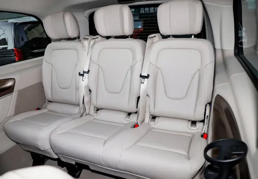 奔馳V級長軸版雖然更長,第三排采用了三個獨立座椅,但是座椅都明顯較窄,且沒有腿托,舒適性也比較常規。