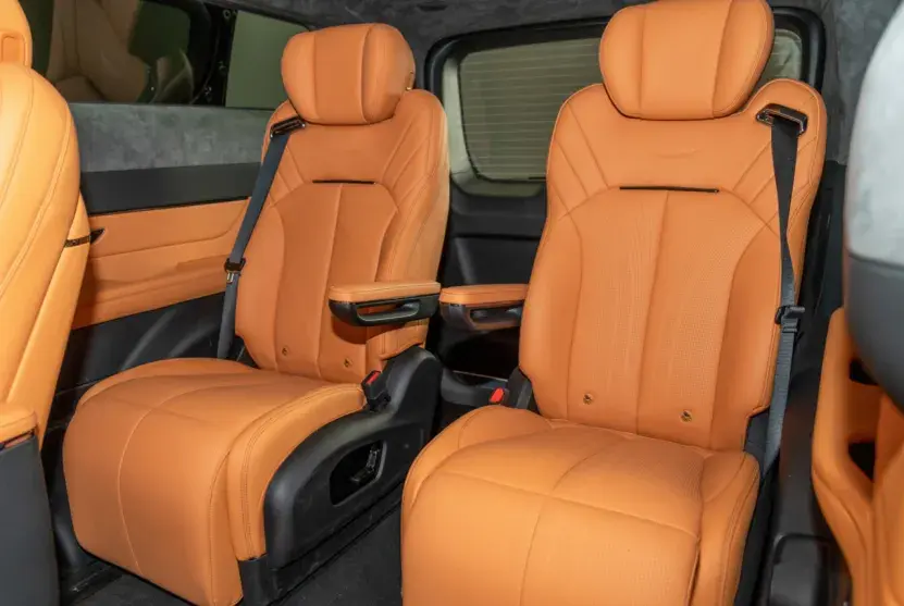 首先是舒適性配置,全車隔音玻璃、真皮座椅、前/后排的座椅加熱、通風和按摩,這些都不算稀奇。二排的小桌板、電動調節、一鍵躺平也算是常規操作。關鍵在于第三排,L380也配上了前后、靠背的電動調節,從外部可以電動放倒,并且加熱和通風全系標配,四驅六座版還有行業獨一檔的腿托調節。